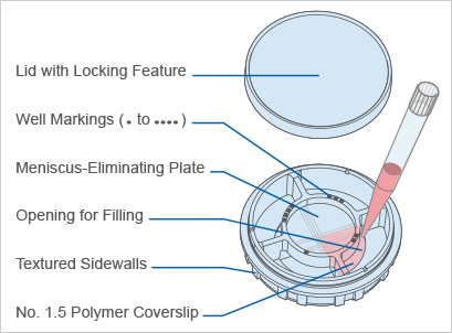 通過分隔成四個(gè)腔室,四格μ35mm培養(yǎng)皿增加了三倍的樣品數(shù)量和通量。這個(gè)特點(diǎn)非常適合在一個(gè)培養(yǎng)皿內(nèi)同時(shí)分析多個(gè)細(xì)胞株或者不同實(shí)驗(yàn)條件。
