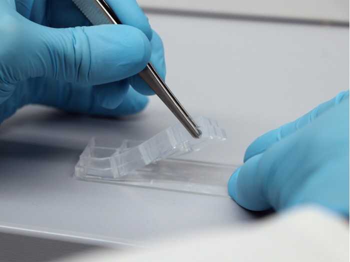 自粘性的12孔硅膠插件粘在一個標(biāo)準(zhǔn)的玻璃載玻片上